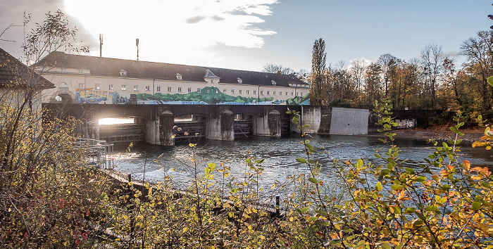 München Blick vom Stauwehr Oberföhring: Isar, Isarinsel Oberföhring