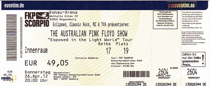 Speak To Me, Breathe, On The Run, Time, The Great Gig In The Sky, Shine On You Crazy Diamond Parts 1, Welcome To The Machine, Pigs (Three Different Ones), Sheep, Astronomy Domine, Learning To Fly, High Hopes, Us And Them, Careful With That Axe Eugene, Take It Back, The Gunner's Dream, The Happiest Days Of Our Lives, Another Brick In The Wall 2, Wish You Were Here, One Of These Days, Comfortably Numb, Run Like Hell.