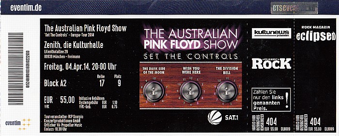 In the Flesh, Take It Back, Sorrow, Set The Controls For The Heart Of The Sun, What Do You Want From Me, High Hopes, Pigs (Three Different Ones), The Happiest Days Of Our Lives, Another Brick In The Wall 2, Shine On You Crazy Diamond 1, Astronomy Domine, The Fletcher Memorial Home, Time, Breathe (Reprise), The Great Gig In The Sky, Keep Talking, Us And Them, Wish You Were Here, One Of These Days, Comfortably Numb, Run Like Hell.